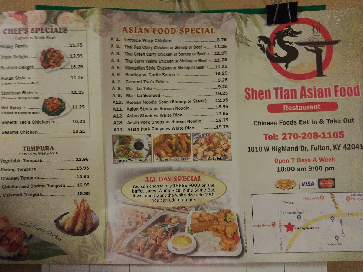 When you step into Shen Tian Asian Food Restaurant, you're in for a treat that spans the rich and diverse flavors of Asian cuisine. The Shen Tian Asian Food Restaurant Menu offers a tantalizing array of dishes that cater to all tastes, from comforting noodle bowls to savory stir-fries. Whether you're craving the bold spices of Thai cuisine, the delicate flavors of Chinese dishes, or something in between, this menu has it all. Located at 1010 W Highland Dr in Fulton, KY, the restaurant’s offerings are a perfect blend of authenticity and creativity, providing a fresh twist on your favorite dishes.